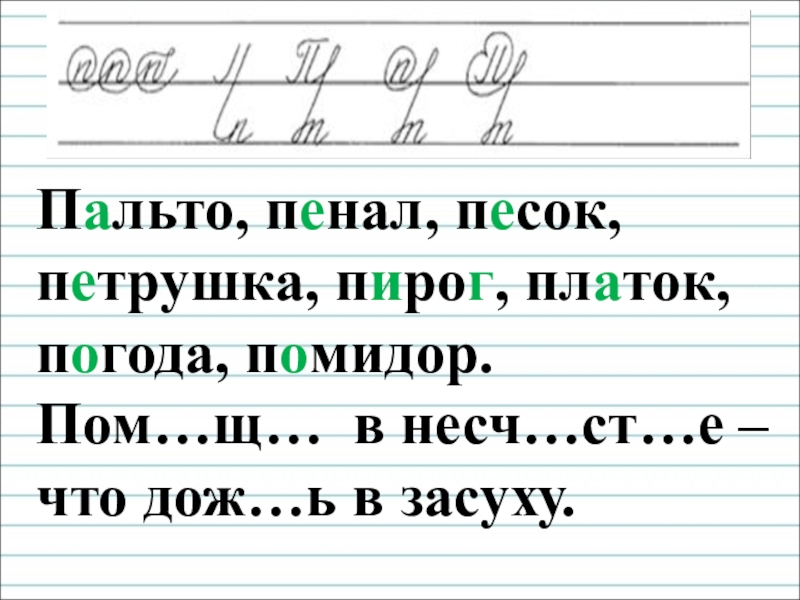 ЧистописаниеПальто, пенал, песок, петрушка, пирог, платок, погода, помидор.