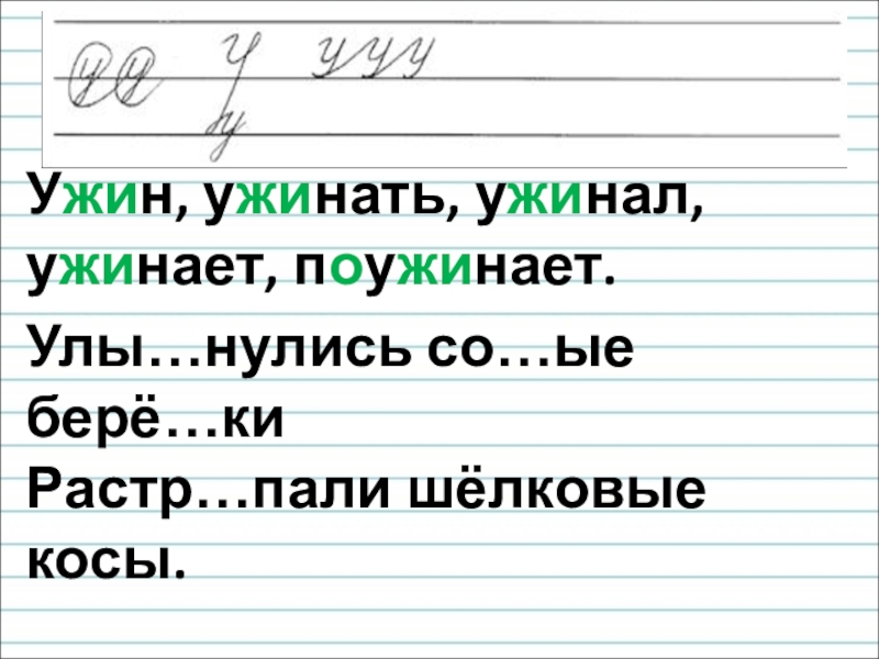 Ужин, ужинать, ужинал, ужинает, поужинает.Улы…нулись со…ые берё…ки