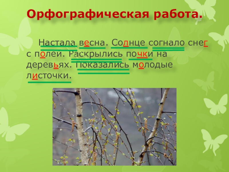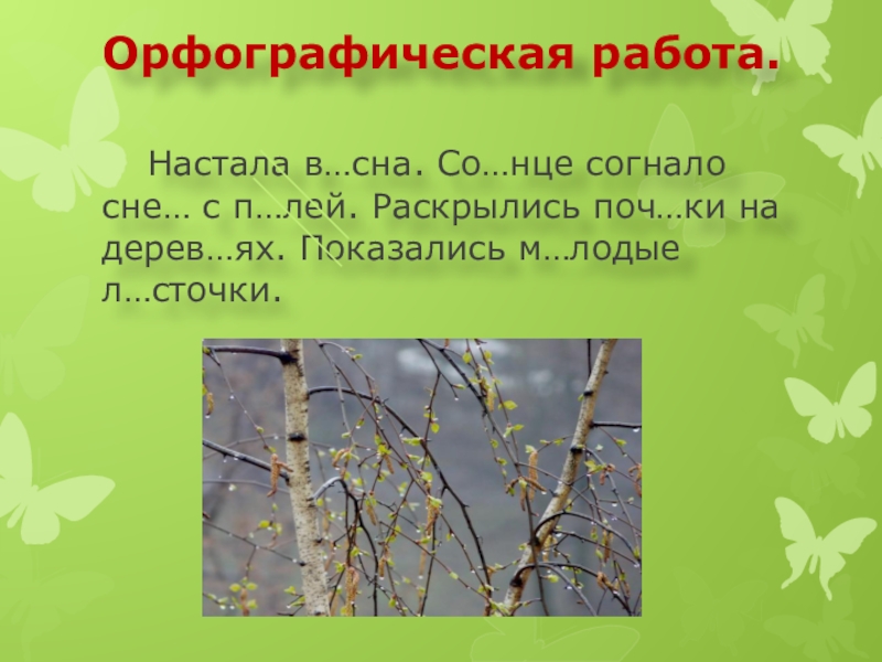 Слайд 5Орфографическая работа. Настала весна. Солнце согнало снег с полей. Раскрылись