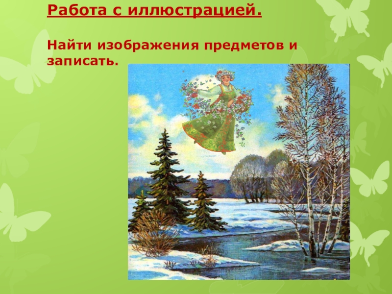 Слайд 15Работа с иллюстрацией. Найти изображения предметов и записать.