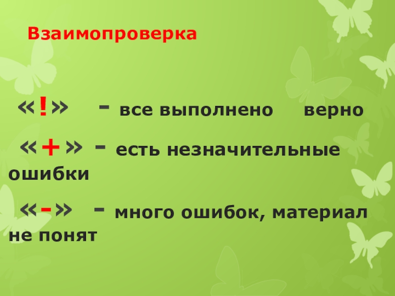 Взаимопроверка «!»  - все выполнено   верно «+» - есть незначительные  ошибки «-» -