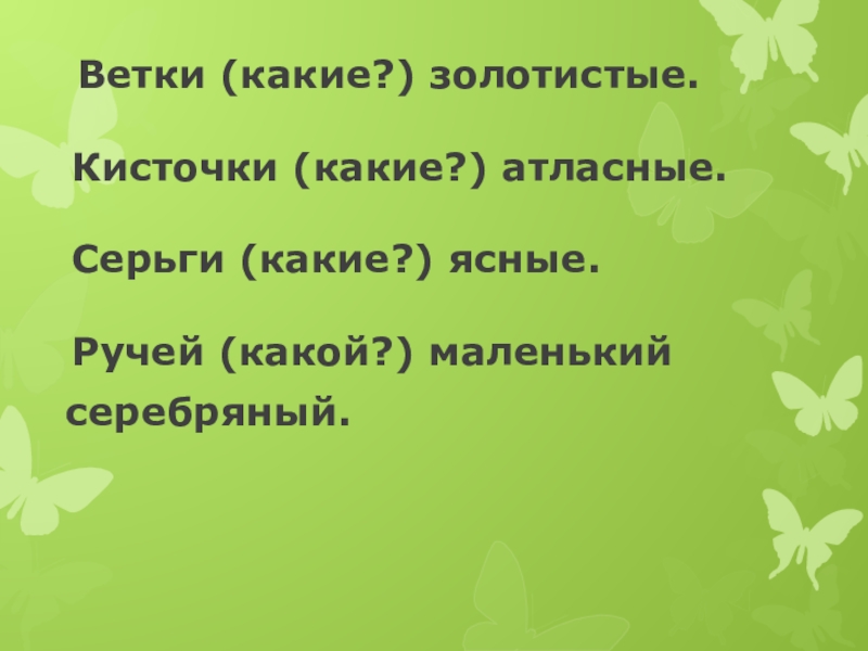 Слайд 14 Ветки (какие?) золотистые. Кисточки (какие?) атласные. Серьги (какие?)