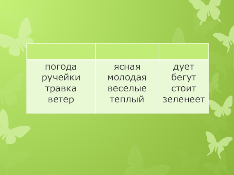 Погода, ясная, ручейки, дует, травка, молодая, бегут, стоит, веселые, зеленее, ветер, теплый.