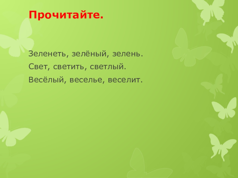 Прочитайте.    Зеленеть, зелёный, зелень.Свет, светить, светлый.Весёлый, веселье, веселит.