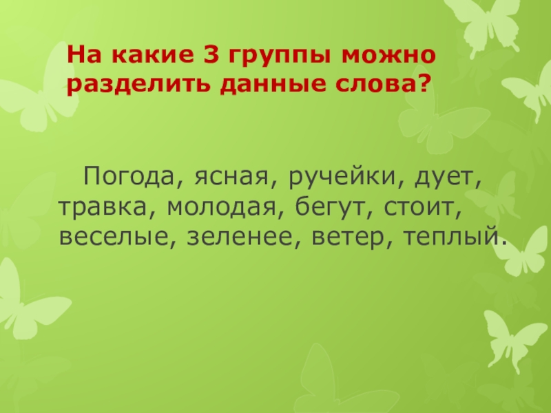 Слайд 6На какие 3 группы можно разделить данные слова?