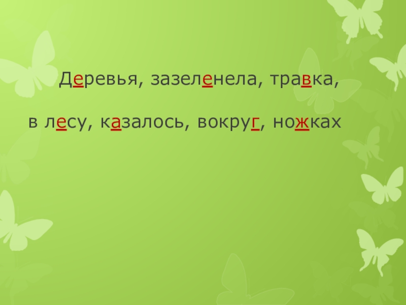 Слайд 12 Деревья, зазеленела, травка, в лесу, казалось, вокруг, ножках
