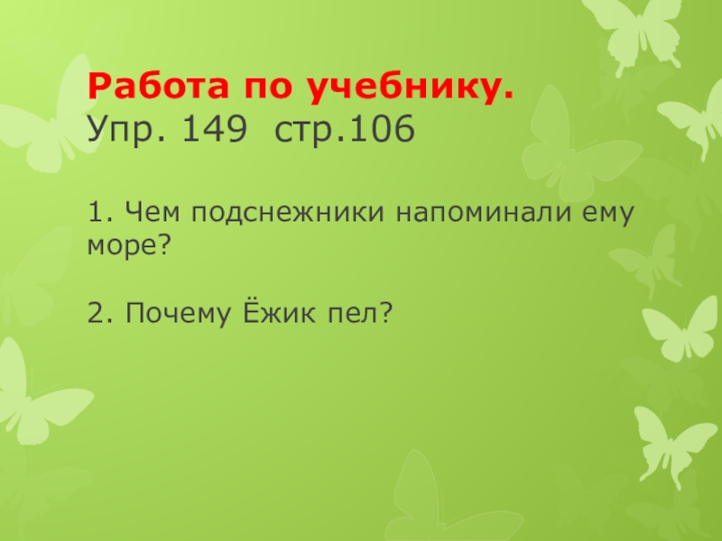 Работа по учебнику. Упр. 149 стр.106  1. Чем подснежники напоминали ему море?  2. Почему Ёжик