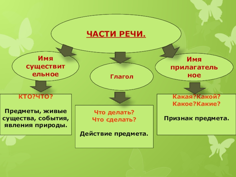ЧАСТИ РЕЧИ.Имя существительноеГлаголИмя прилагательноеКТО?ЧТО?Предметы, живыесущества, события,явления природы.Что делать? Что сделать?Действие предмета.Какая?Какой?Какое?Какие? Признак предмета.