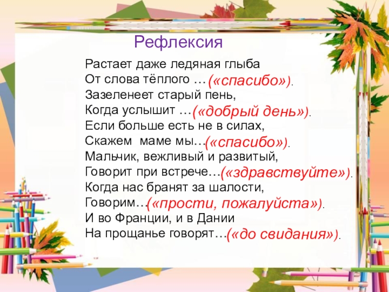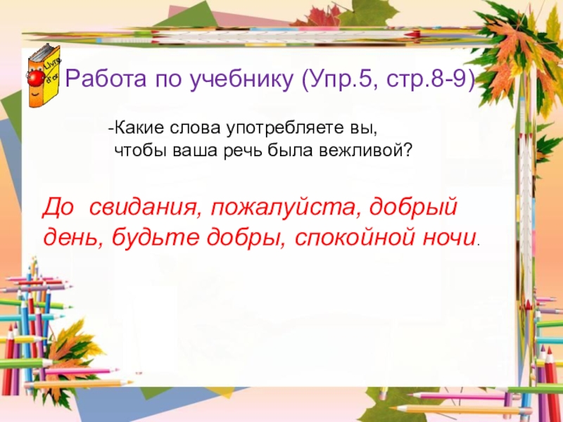 До свидания, пожалуйста, добрый день, будьте добры, спокойной ночи.