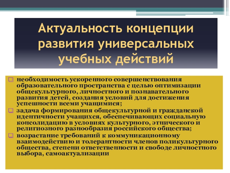 необходимость ускоренного совершенствования образовательного пространства с целью оптимизации общекультурного, личностного и познавательного развития детей, создания условий для достижения успешности всеми учащимися;