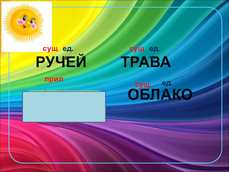 РУЧЕЙ    ТРАВАТЁПЛАЯОБЛАКОсущ.сущ.сущ.прил.ед.ч.ед.ч.ед.ч.