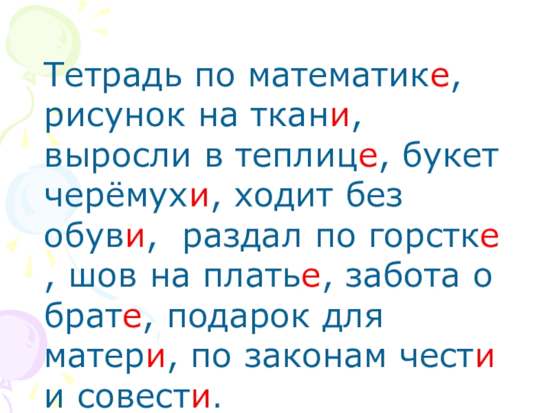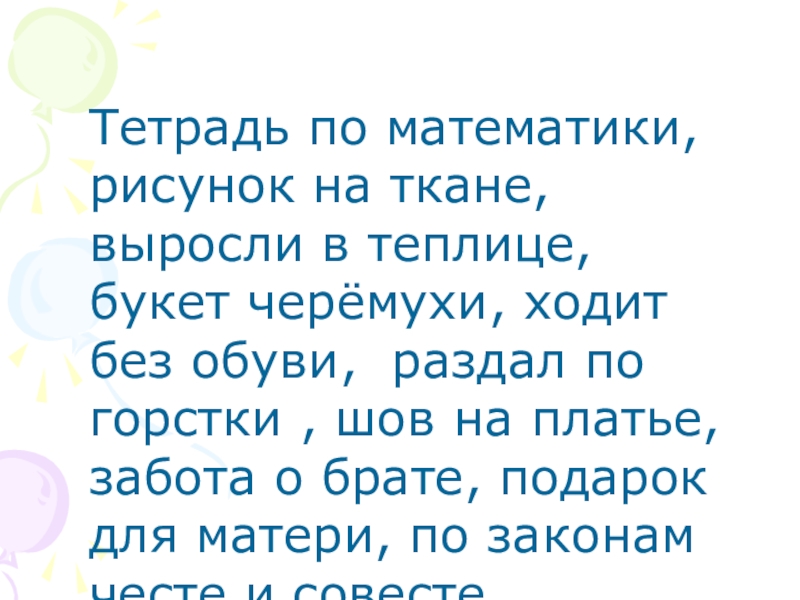 Тетрадь по математики, рисунок на ткане, выросли в теплице, букет черёмухи, ходит без обуви, раздал по горстки