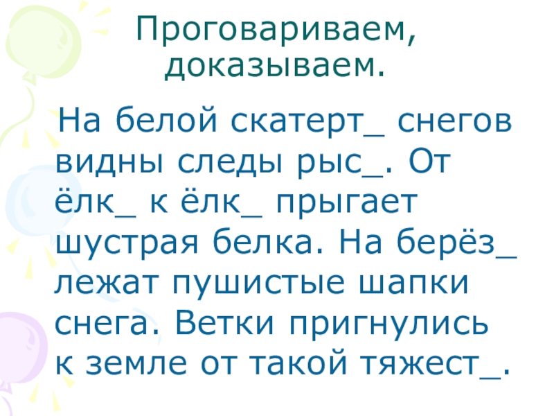 Проговариваем, доказываем. На белой скатерт_ снегов видны следы рыс_. От ёлк_ к ёлк_ прыгает шустрая белка. На