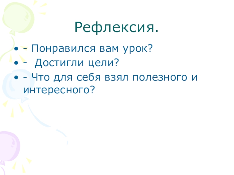 Рефлексия.- Понравился вам урок?- Достигли цели?- Что для себя взял полезного и интересного?
