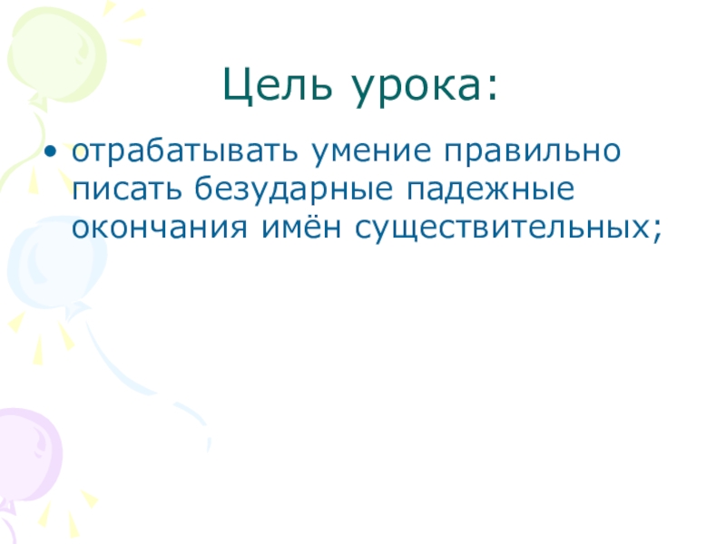 Цель урока:отрабатывать умение правильно писать безударные падежные окончания имён существительных;