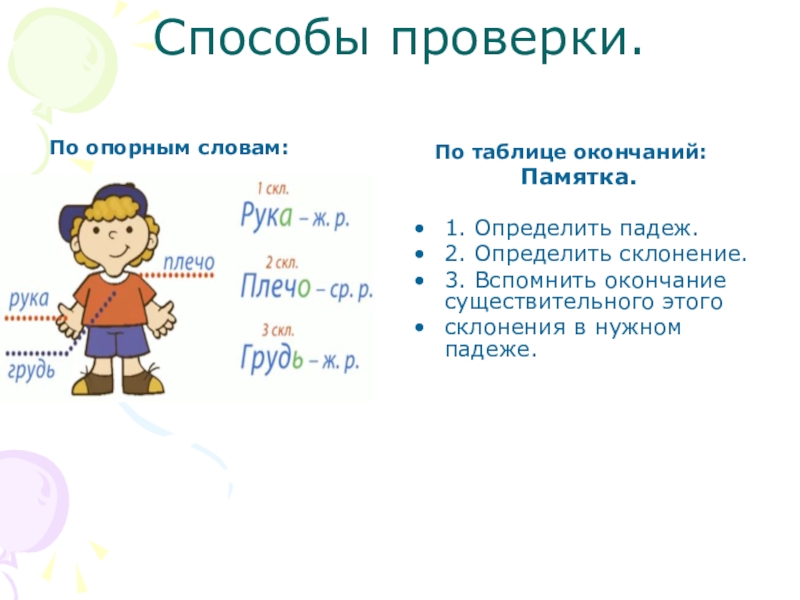 Способы проверки.По опорным словам:  По таблице окончаний:       Памятка.1. Определить падеж.2.