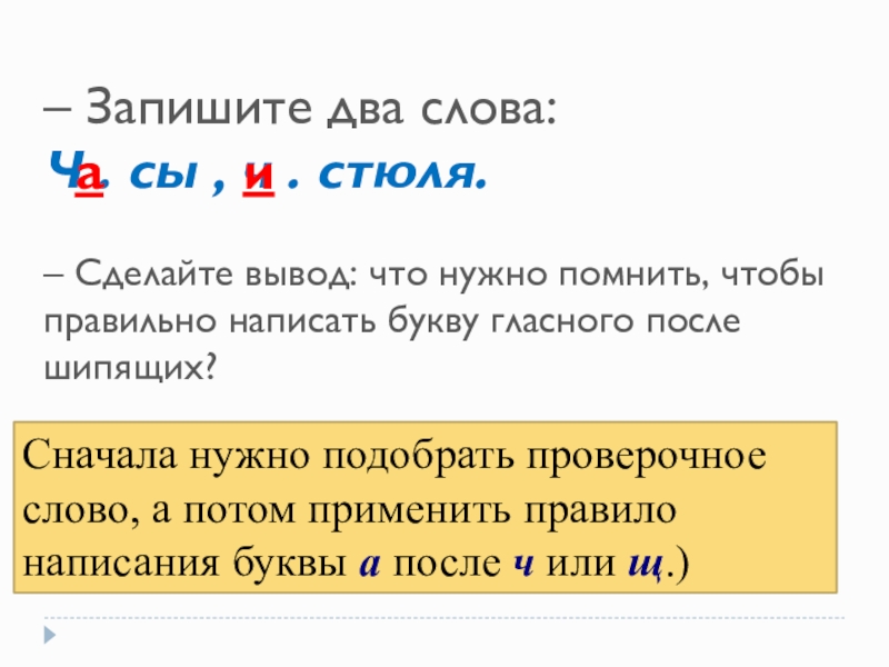 Сначала нужно подобрать проверочное слово, а потом применить правило написания буквы а после ч или щ.)