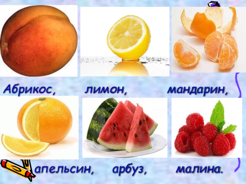 Абрикос,    лимон,      мандарин,апельсин,   арбуз,
