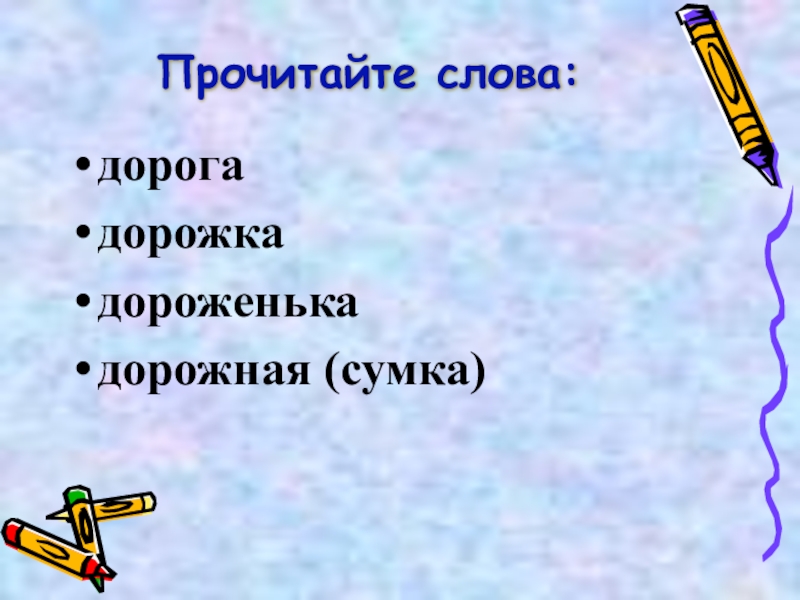 дорогадорожкадороженькадорожная (сумка)Прочитайте слова: