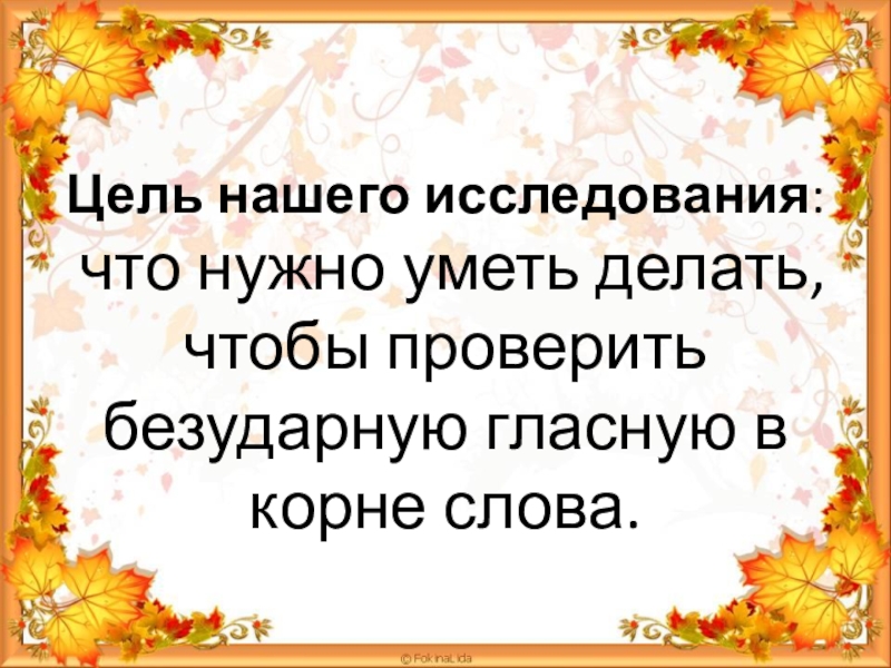 Слайд 9 Цель нашего исследования: что нужно уметь делать, чтобы проверить безударную гласную