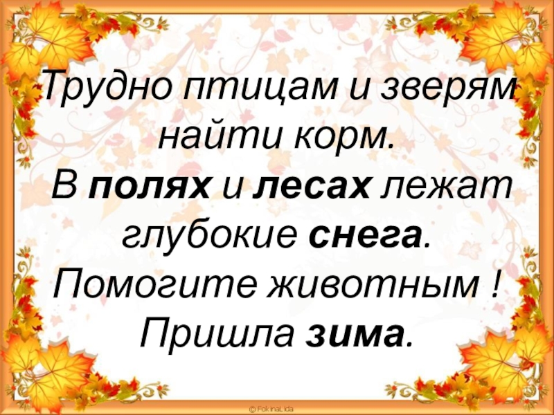 Трудно птицам и зверям найти корм.  В полях и лесах лежат глубокие снега.  Помогите