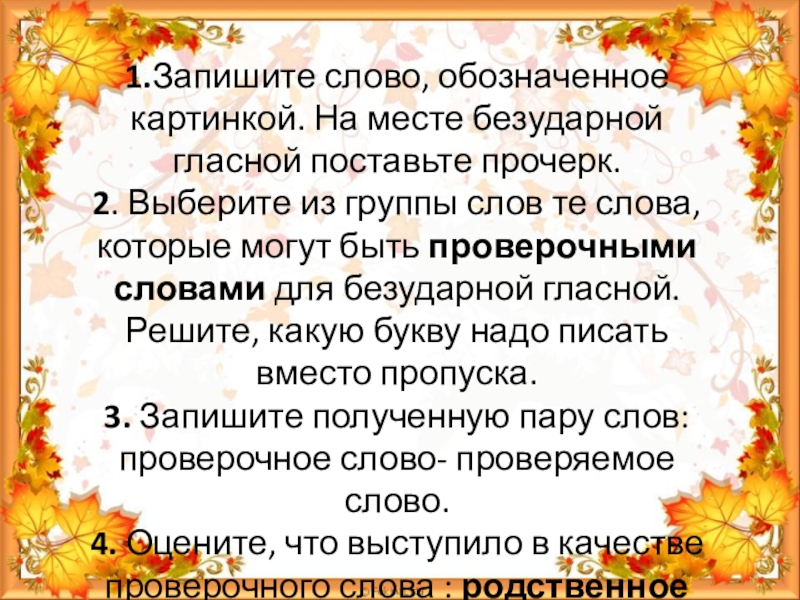 Презентация, доклад по русскому языку на тему Учимся писать безударные гласные в корне слова 2 класс
