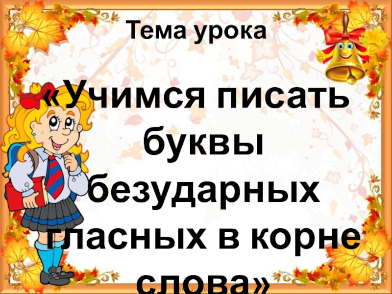 Тема урока«Учимся писать буквы безударных гласных в корне слова»