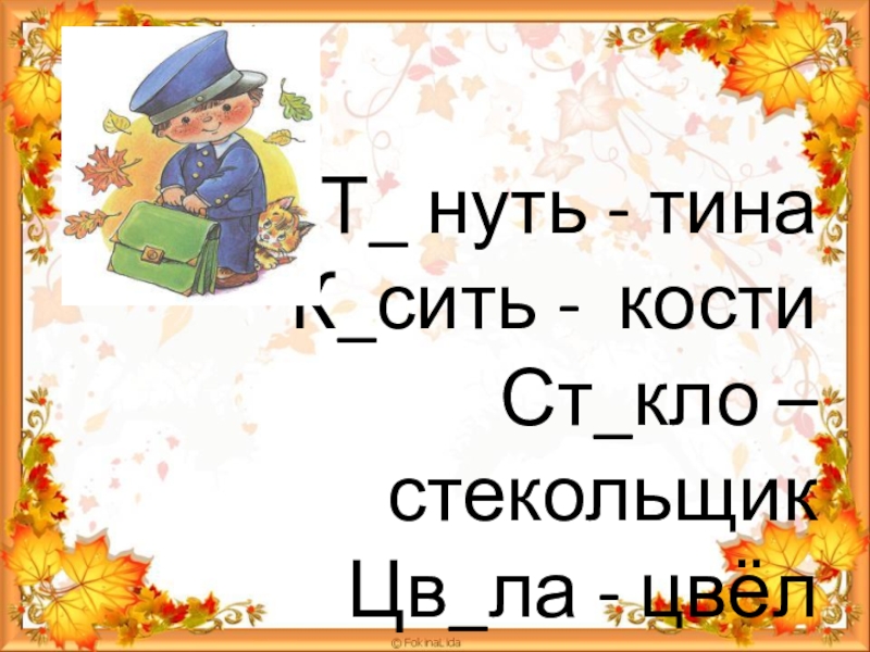 Слайд 8 Т_ нуть - тина К_сить - кости Ст_кло – стекольщик Цв_ла - цвёл