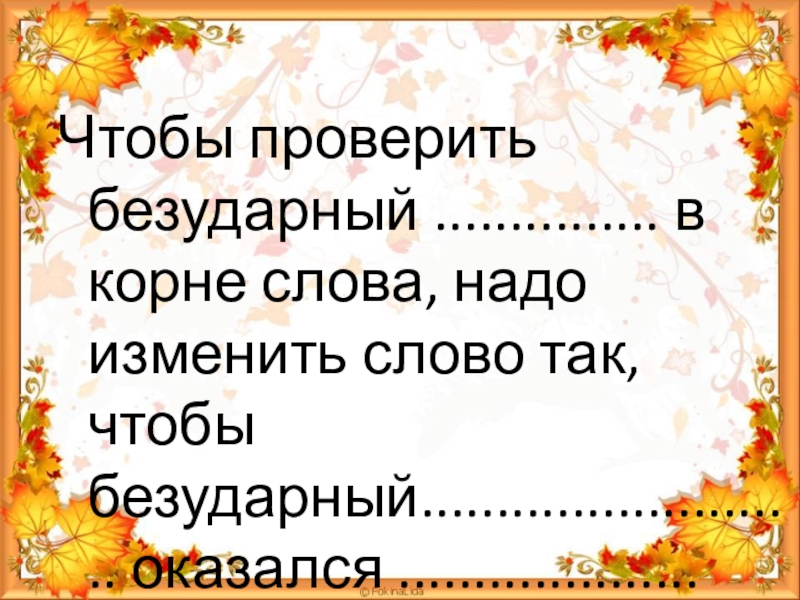 Чтобы проверить безударный гласный в корне слова, надо подобрать такое................. слово или изменить.........................слова так, чтобы безударный