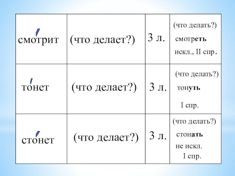 3.Определить спряжение глагола (посмотреть, на что оканчивается неопределённая форма глагола, не относится ли глагол к глаголам-исключениям)