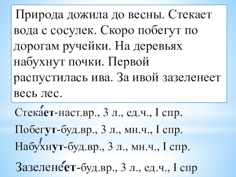 Природа (до)жила (до)весны. (С)текает вода (с)сосулек. Скоро (по)бегут (по)дорогам ручейки. (На)деревьях (на)бухнут почки. Первой (рас)пустилась ива. (За)ивой (за)зеленеет весь лес.