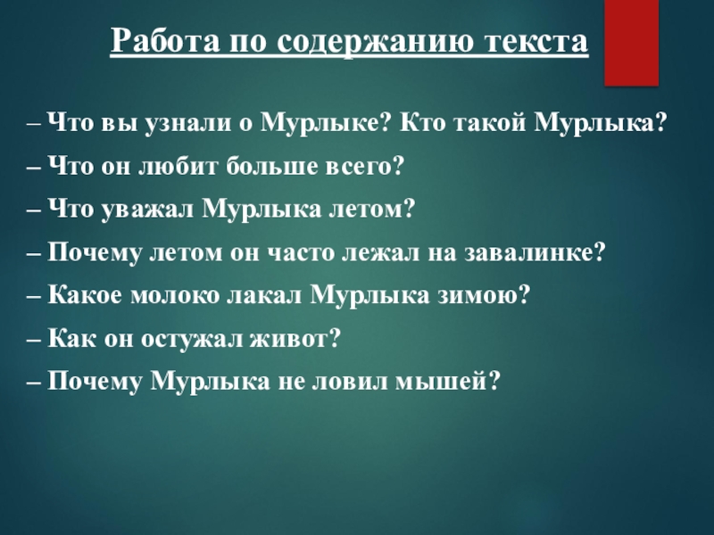 Работа по содержанию текста– Что вы узнали о Мурлыке? Кто такой Мурлыка?– Что он любит больше всего?–