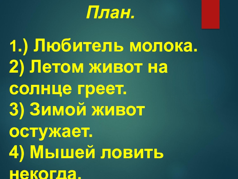 План. 1.) Любитель молока. 2) Летом живот на солнце греет. 3) Зимой живот остужает. 4) Мышей ловить