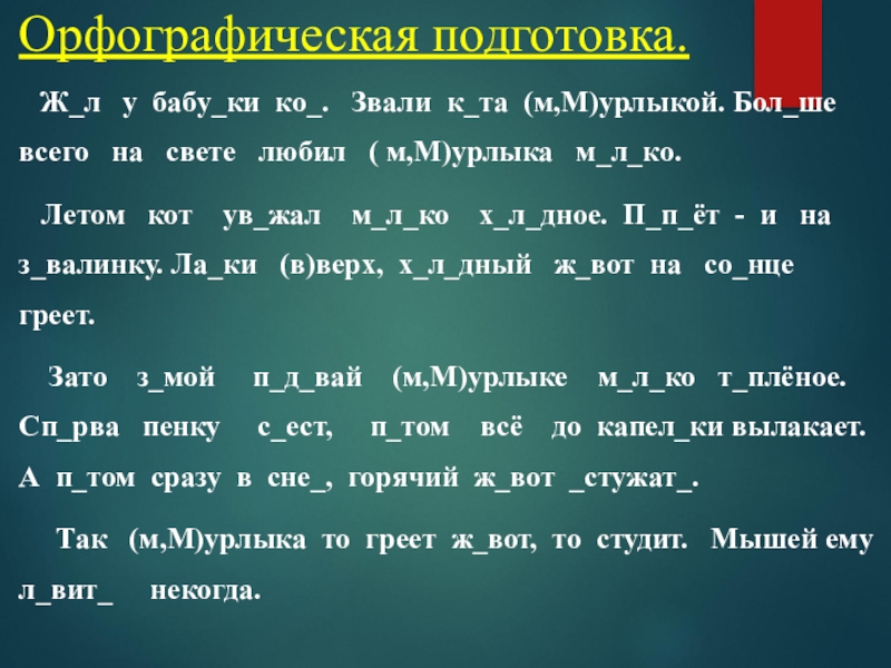 Орфографическая подготовка.    Ж_л  у бабу_ки ко_.  Звали к_та (м,М)урлыкой. Бол_ше  всего