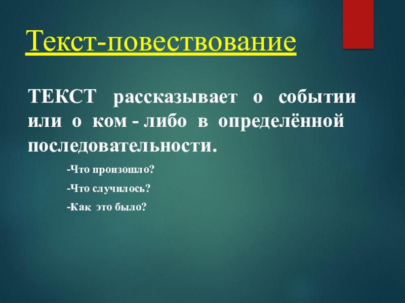 Текст-повествованиеТЕКСТ   рассказывает  о  событии или о ком - либо в определённой последовательности.