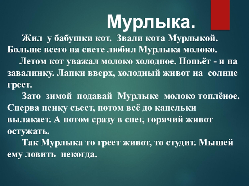 Мурлыка. Жил у бабушки кот. Звали кота Мурлыкой. Больше всего на свете любил Мурлыка молоко. Летом кот уважал молоко холодное. Попьёт - и на