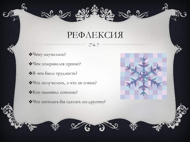 РефлексияЧему научились?Чем понравился проект?В чем была трудность?Что получилось, а что не очень?Кто оказывал помощь?Что хотелось бы сделать