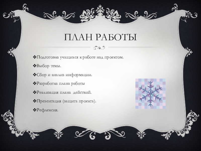 План работыПодготовка учащихся к работе над проектом.Выбор темы.Сбор и анализ информации.Разработка плана работы Реализация плана действий.Презентация (защита