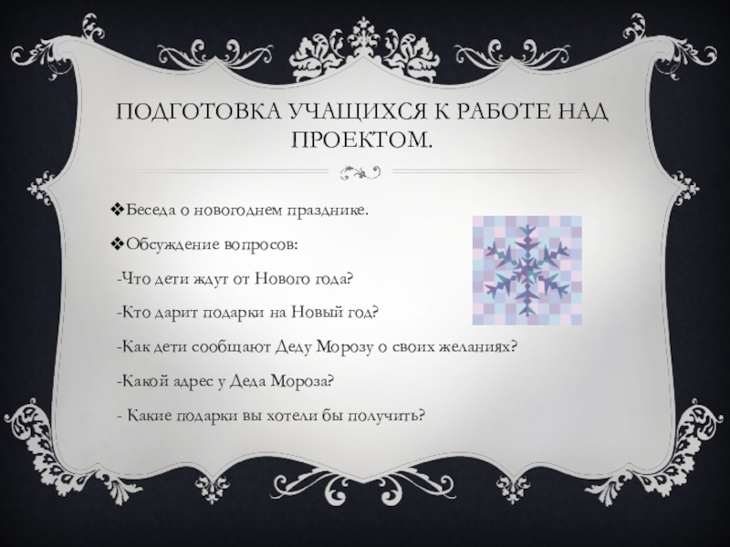 Подготовка учащихся к работе над проектом.Беседа о новогоднем празднике.Обсуждение вопросов:-Что дети ждут от Нового года?-Кто дарит подарки