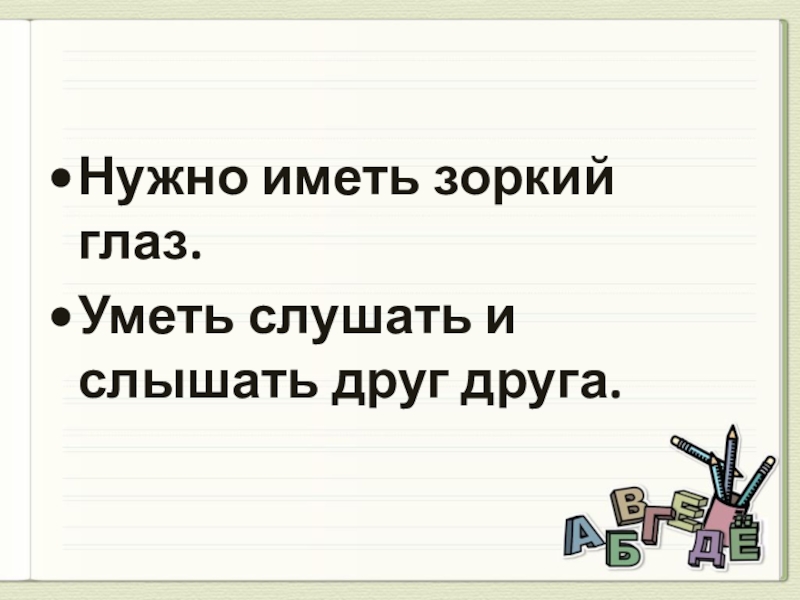 Нужно иметь зоркий глаз.Уметь слушать и слышать друг друга.
