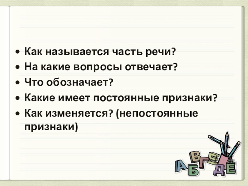 Как называется часть речи?На какие вопросы отвечает?Что обозначает?Какие имеет постоянные признаки?Как изменяется? (непостоянные признаки)