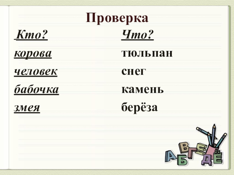 Проверка Кто? коровачеловекбабочказмея          Что? тюльпанснегкаменьберёза