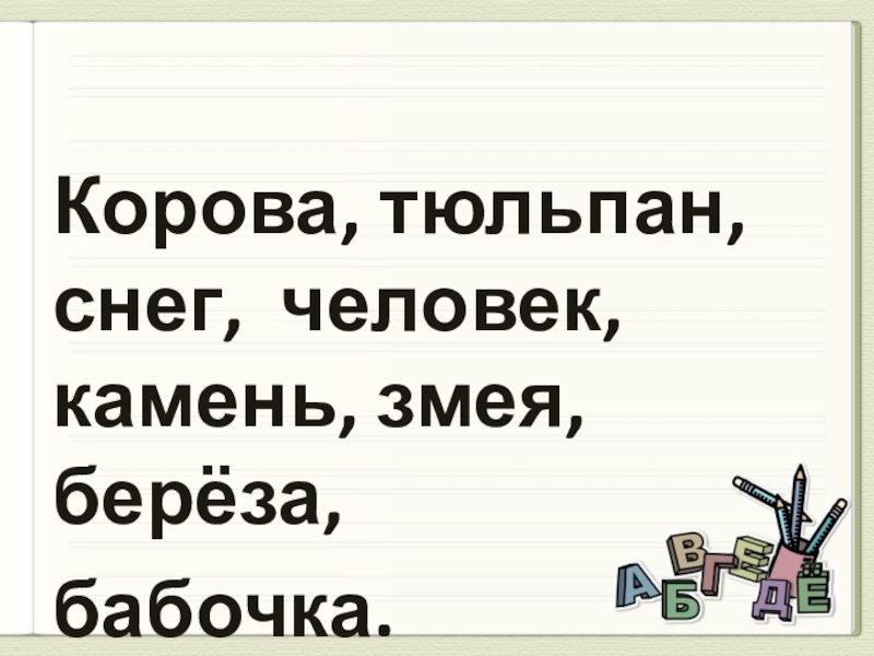 Корова, тюльпан, снег, человек, камень, змея, берёза, бабочка.