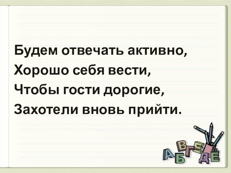 Будем отвечать активно,Хорошо себя вести,Чтобы гости дорогие,Захотели вновь прийти.