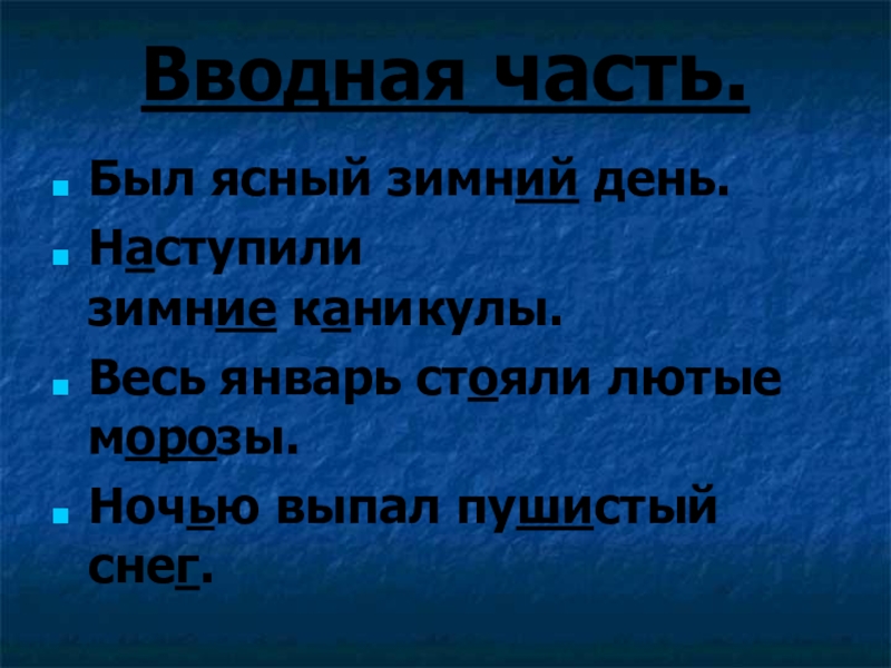 Вводная часть. Был ясный зимний день.Наступили зимние каникулы.Весь январь стояли лютые морозы.Ночью выпал пушистый снег.