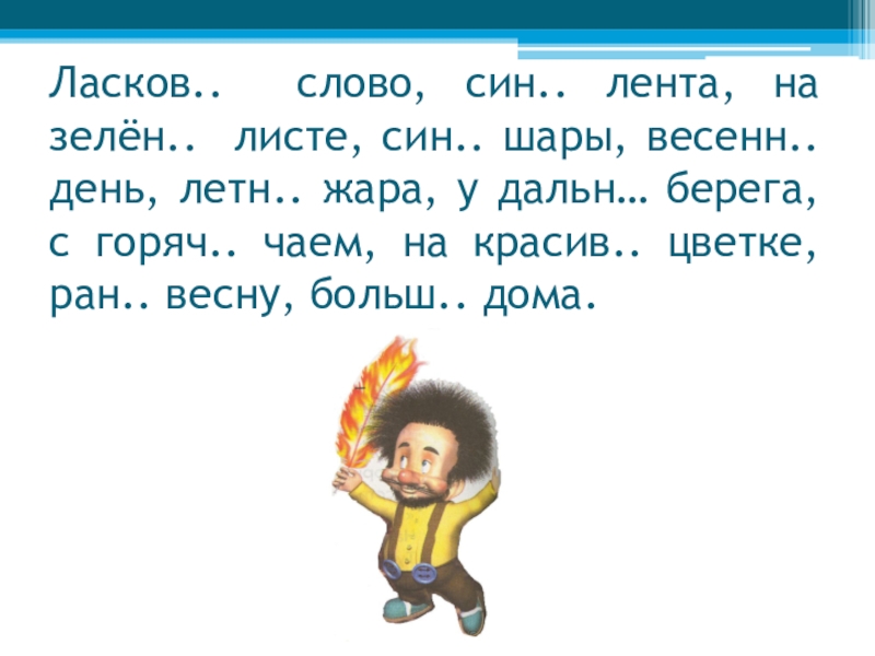 Слайд 9Ласков.. слово, син.. лента, на зелён.. листе, син.. шары, весенн.. день,