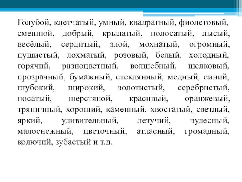 Слайд 10Голубой, клетчатый, умный, квадратный, фиолетовый, смешной, добрый, крылатый, полосатый, лысый, весёлый,