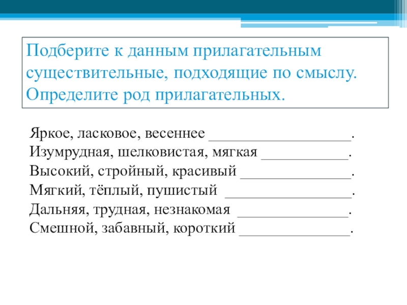Подберите к данным прилагательным существительные, подходящие по смыслу. Определите род прилагательных.