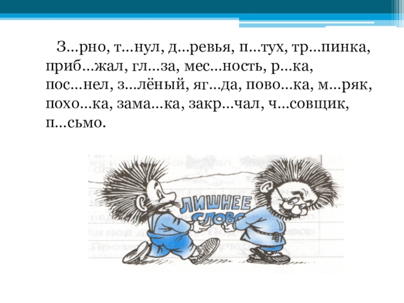 Слайд 3 З…рно, т…нул, д…ревья, п…тух, тр…пинка, приб…жал, гл…за, мес…ность,