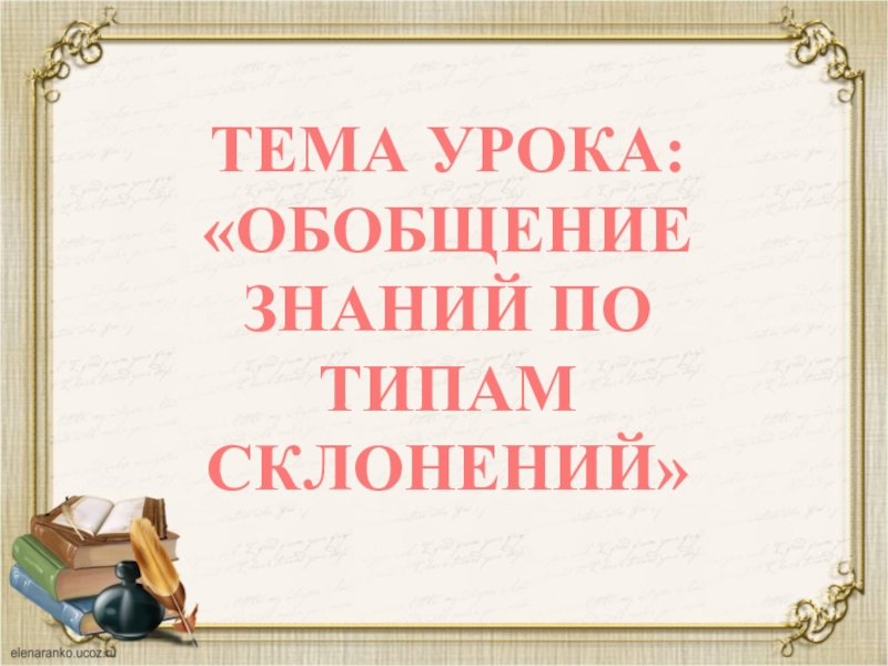 Слайд 2ТЕМА УРОКА: «ОБОБЩЕНИЕ ЗНАНИЙ ПО ТИПАМ СКЛОНЕНИЙ»